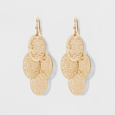 Bring old-world style to your earring collection with the Filigree Chandelier Earrings from A New Day. The chandelier-style filigree coin earrings help you make a statement. Pair them with gold bangles for a fun twist to your everyday jewelry choices. If youβre not satisfied with any Target Owned Brand item, return it within one year with a receipt for an exchange or a refund.