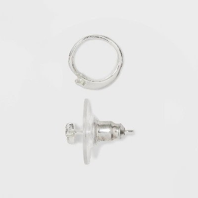 Bring current fashion to your jewelry box with this 3-Piece Sterling Silver Star Stud Cubic Zirconia Moon and Endless Hoop Earring Set from A New Dayโข. This set features three silver-finished pieces, including a pair of moon and star-shaped earrings for a sweet, feminine look. The star is studded with cubic zirconia for an elegant design that sparkles in the light โ just like stars in the night sky. The hoop earrings end in matching cubic zirconia pendants in a rectangular shape. These unique pieces are great on their own or paired together. Their post back closures offer you easy on-and-off wear, and the nickel-free construction makes them suitable for most skin types.