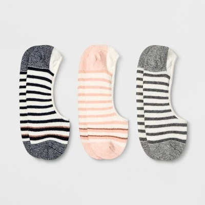 The Lurex Striped Liner Socks from A New Day™ are a great way to keep your feet comfortable while concealing your socks. Made from soft cotton-blend fabric with a hint of nylon and spandex, the three-pack of socks will keep your feet cozy — and they stretch to fit snugly around your toes and heels, creating a perfect no-sock look. These socks are styled in black, peach or gray stripes against a white background.