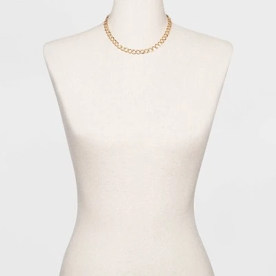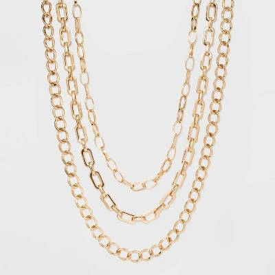 Elevate your look in one fell swoop with the Three-Piece Metal Chain Link Necklace from A New Day™. The multi-strand necklace in gold tone is made of three individual strands of chunky chains in different styles to complete your outfit in statement style. It has a shorter, oval-link chain sitting on the inside of a longer rectangle-link chain, while the outermost chain is made of wavy round links. The three strands of this chunky chain necklace can also be worn separately for a little pared-down effect. Wear the multi-strand look with an evening turtleneck dress, and sport a single strand on your crewneck tee for easy daytime wear.