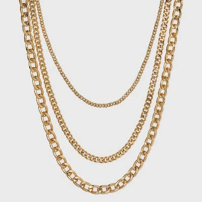 Get a layered jewelry look with ease with this 16-Inch Layered Curb Chain Necklace from A New Dayโข. Featuring three different thicknesses of chain in a shiny gold finish, this three-layer gold chain necklace makes it easy to create a coordinated look that instantly elevates a plain tee or a variety of other outfits. A lobster claw clasp closure makes for easy fastening at the back, and the shiny gold finish pairs perfectly with casual and dressy looks alike.