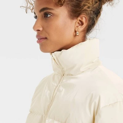 Stay cozy and dry wearing this Short Puffer Jacket from A New Day™. This long-sleeve puffer jacket with a shorter length makes a cozy staple in your outerwear closet. Made from lightweight water-resistant material with a soft quilted finish, it keeps you in warm comfort through the chilly season. The smooth taffeta lining ensures comfy wear, while the front zipper allows for easy layering. Plus, the on-seam pockets add functional style. Layer over a range of outfits for versatile cool-weather styling.