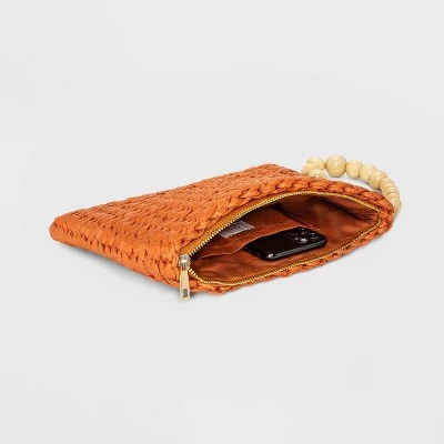 Flaunt your distinct accessory style by carrying this Straw Beaded Clutch from A New Day™. Woven with orange straw and accented with an off-white beaded handle, this clutch brings textured flair to your outfits. Designed with a main compartment and interior side pockets, this clutch offers ample space for your belongings while keeping them secure with a zipper closure. You can easily mix and match this beaded clutch with a variety of outfits to add natural charm to your looks.