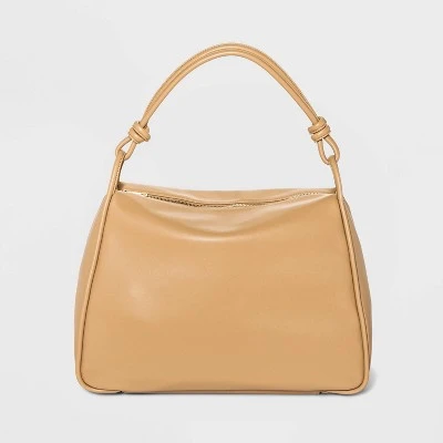 Carry your belongings in an elegant style to the office, market or anywhere else you go with this Carryall Tote Handbag from A New Day™. Designed with a broad bottom that narrows at the top for a standout look, this tote handbag makes a stylish addition to your accessory collection. It comes with a main compartment and multiple interior pockets to help provide ample space for your pouch, cell phone and other belongings. Easy to mix and match with a variety of outfits, this solid-color handbag offers convenient carrying thanks to the knotted adjustable handle, and it has a flat bottom that balances easily on tabletops.