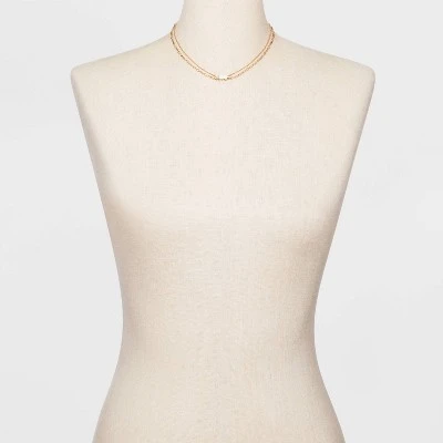 The Mother of Pearl and Metal Pendant Two-Row-Layered Necklace from A New Day™ is a must-have in your jewelry box. This layered necklace is made from nickel-free metal in an elegant gold finish and features two chains. The inner chain has classic cable chain links and features a pointed-oval pendant in white MOP and golden corner. The outer chain has little chunky chain links along with faceted bar links in a golden finish. Both chains are connected to a lobster-claw clasp at the center back with an extra length of chain, making the whole necklace adjustable. This versatile short layered necklace can be worn with practically any outfit, either casual or formal.