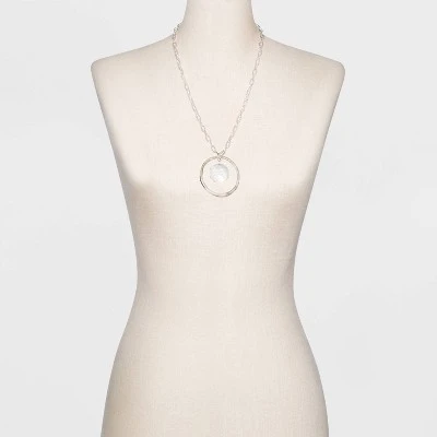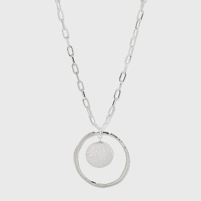 Sparkle any outfit easily with this Hammered Ring and Disc Pendant Necklace from A New Dayโข. This silver-tone necklace features a long-linked chain that falls downward to the top of the bust to create a dramatic look. The chain comes complete with a pendant showcasing a disc held inside a hammered ring for artisanal flair. Whether you’re getting ready for a special event or just accessorizing a fun look to meet up with friends, this matinee-length necklace will complement your outfits in cool style.