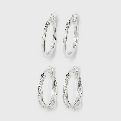 Pick up something that will never go out of fashion with the Braided and Polished Silver Plated Hoop Earring Set from A New Dayโข. This set includes two pairs of simple hoop earrings in classic styles you’re sure to get plenty of wear out of. A pair of delicate hoops shine in a high-polish finish alongside a pair of braided hoop earrings that keep the minimalist style while adding a touch of depth to the look. These silver plated hoops are perfect for everything from sweats to swanky dresses thanks to their timeless look, and their click-down closures make them easy to wear for any occasion โ even if it’s just sitting on the couch.