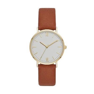The Classic Roman Strap Watch from A New Dayโข is perfect for work or casual, everyday wear. Sleek and sophisticated, the round wristwatch features yellow-gold metal trim along the face with analog time display, along with Roman numeral markers at the sixth and twelfth hours. The textured, brown faux-leather strap brings extra appeal and is secured with a buckle closure for a sure fit.