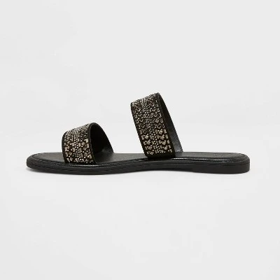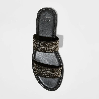 Keep your feet cool and comfortable in fashion-forward style with these Kersha Embellished Slide Sandals from A New Day™. These neutral open-toe slide sandals make a versatile addition to your warm-weather footwear. Decorated with different shapes of beaded embellishments for eye-catching style, they feature a double band instep strap for a better fit. The flat heel along with a slip-on style make them super comfortable and easy to wear, while the textured outsole ensures a better grip while walking. Pair with skinny jeans and a basic tee or a breezy maxi dress to flaunt your on-trend style.