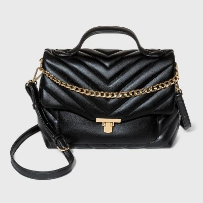Add unique style to your outfits while providing a convenient option for your everyday carry with this Quilted Top-Handle Turn-Key Closure Satchel Handbag from A New Dayโข. This structured satchel handbag boasts tons of details, including quilted stitched details on the faux leather shell for a chic textured look. The top flap features a metal chain detail as well as a turn-key closure for charming vintage-inspired details, while a single top handle and adjustable shoulder strap offer you multiple options for comfortable carry in your hand, over your shoulder or across your body.