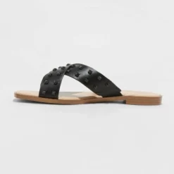 Add some chic style to your outfit with these Emmy Studded Crossband Sandals from A New Day™. These neutral open-toe sandals make a versatile addition to your warm-weather footwear. They feature a crisscross strap design over the foot that’s decorated with pyramid stud details for an edgy look. The flat heel along with a slip-on style make them super comfortable and easy to wear, while the textured outsole gives better grip while walking. Pair with skinny jeans and a basic tee or a breezy maxi dress to flaunt your on-trend style.
