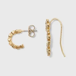 You’ll love the intricate detail of this pretty Ear Climber and Crystal Glass Stud Earring Set from A New Dayโข. This set includes a pair of geometric stud earrings, gem-studded hoop earrings and a pair of bejeweled ear climbers in a floral motif, all in a high-polish yellow gold-tone finish. Each post earring comes complete with a butterfly back for comfortable and secure wear, while the wires on the climbers are designed to stay in place without extra backs. Wear pairs separately for a simple and elegant jewelry look, or easily coordinate two or more pairs together for maximum sparkle.