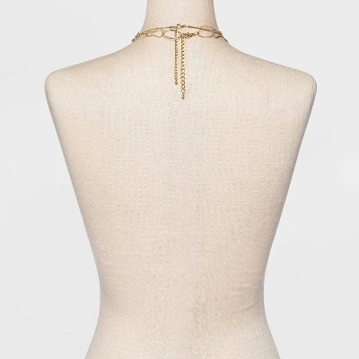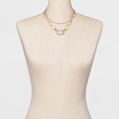Make a plain outfit pop with textured flair from this Layered Link Chain Necklace from A New Dayโข. The closely linked box chains of the choker necklace complement a lucite chain necklace with large loops of a slightly longer length. The lucite chains end in a clear, oval-shaped pendant for a touch of elegant flair that goes nicely with any dress. It has an adjustable lobster claw clasp so you can find the best fit for your neck, and the gold finish easily pairs with your other gold jewelry.