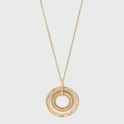 Finish off your everyday looks with the elegant style of this Multi Ring Pendant Necklace from A New Day™. This gold-tone necklace features a linked chain with a multi ring round pendant that spruces up the look of your outfits. This nickel-free necklace easily closes with the lobster claw clasp closure and can be paired with anything from blouses to sweaters to dresses for a chic finish.