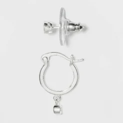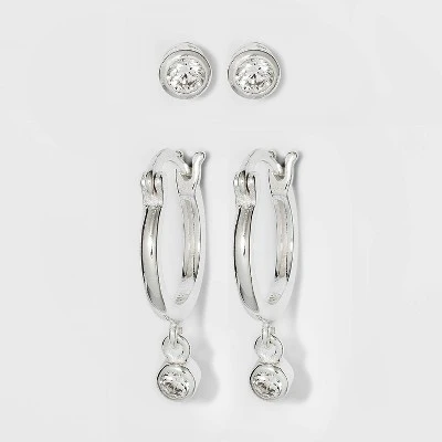 Keep it simple and chic with the Sterling Silver Cubic Zirconia Hoop Earring Set from A New Dayโข. This set includes two pairs of sterling silver earrings in classic styles you’re sure to get plenty of wear out of. A pair of round-cut CZs are set in simple bezel settings that let their light shine through, while the pair of dainty hoop earrings have small, dangling CZ charms for a subtle shimmer. Wear pairs separately for a simple, minimalist jewelry look, or easily coordinate two or more pairs together for a cohesive look with a good dose of sparkle.