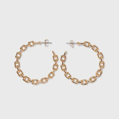 Add a chic vibe to any outfit with these Gold Linked Hoop Earrings from A New Dayโข. These round hoop earrings make a perfect accessory for any occasion. They feature an interlinked chain design in a gleaming gold tone to add edgy texture and a dose of extra shine to your everyday looks. These lightweight hoop earrings come with post-back closures for secure, easy and comfortable wear, and are made from nickel-free metal to suit most skin types. Wear them with a wrap dress and heels for a night out or wear with a simple jeans and tee combo for a chic finishing touch to your casual ensemble.