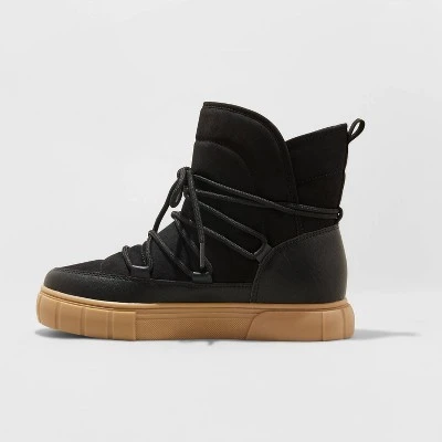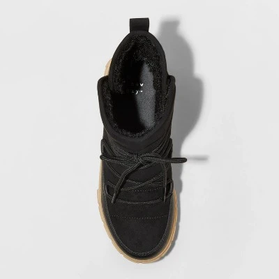 Bring on-trend style to your cool-weather footwear collection with these Erika Lace-Up Boots from A New Day™. Featuring a slip-on style and contrasting dark-hued exterior, these boots make for a staple item that you can wear again and again with lots of different outfits. Plus, these laced boots have a low 1.25-inch heel and flexible sole for all-day comfort. Great for pairing with jeans, leggings and even loungewear, you’ll reach for these boots daily.