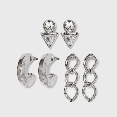 The Crystal Earring Set from A New Day™ makes a sparkly addition to your accessory collection. This pack of lightweight earrings includes three pairs of earrings made of nickel-free material in a silver-tone finish for elegant style and shine. There’s a pair of dangle earrings with chunky chain links, a pair of flat open-hoop earrings and crystal studded earrings with a geometric design. Timeless yet modern, these dazzling earrings are sure to be your day-to-night favorites — match these with your existing wardrobe pieces, from pared-back dresses to casual or dressy outfits, for an instant style upgrade.